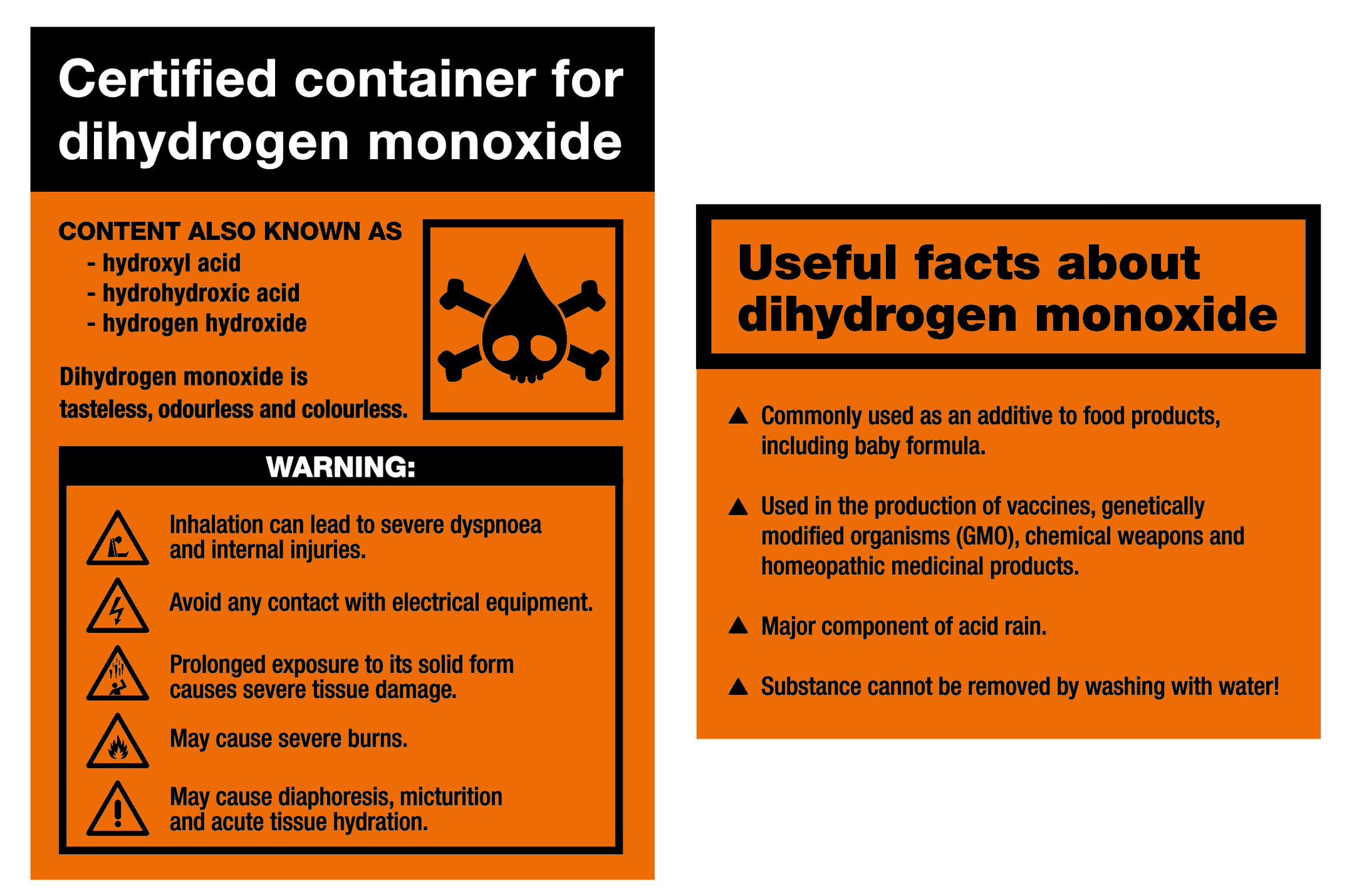 For the most part, you're fairly safe around dhmo. You know, the substance that every single living being relies on to survive? Water is a transparent, tasteless, odorless, and nearly colorless chemical substance, which is the main constituent of earth's streams, lakes, and oceans. Dihydrogen monoxide (dhmo) is a colorless and odorless chemical compound, also referred to by some as dihydrogen oxide, hydrogenhydroxide, hydronium hydroxide, hydroxicacid, or simply hydric acid, that is a constituent of many known toxic substances, diseases and. Most important chemical properties of dihydrogen monoxide include Using the same logic, the chemical compound h20 can also be named using the the systematic name of a compound can be assigned based on its chemical formula. Dihydrogen monoxide (dhmo) is a rarely used name of water. This means they contain two hydrogen atoms and one oxygen atom. H_2o the first part of the name, dihydrogen, implies the presence of two hydrogen atoms. According to the university of arizona, this. The dihydrogen monoxide parody involves calling water by an unfamiliar chemical name, most often dihydrogen monoxide (dhmo). There are, however, certain situations where it truly is dangerous According to the iupac n2o follows the nomenclature of inorganic.